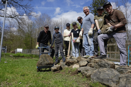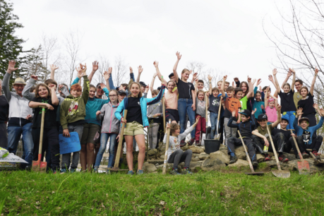 Eine zweite Gruppe pflanzte gleichzeitig an der westlichen Grenze des swoboda alpins fünfzig Sträucher für eine Vogelschutzhecke – mehrere Nistkästen für Singvögel hängen dort bereits seit einigen Wochen. Echte Schwerstarbeit war dann das Aufschichten eines großen Steinhaufens, der als Unterschlupf für Tiere dienen soll. Hierbei packte aber nicht nur die ältere Generation mit an – auch viele Kinder übten sich im Umgang mit Pickel und Sackkarre und halfen beim Stapeln der Steine tatkräftig mit.